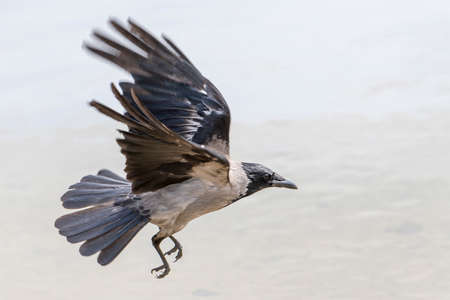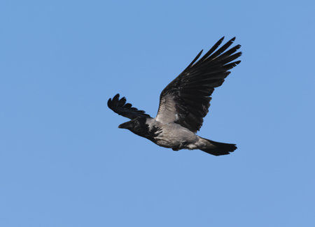 Hooded crow (Corvus cornix) flying in the blue sky in spring.