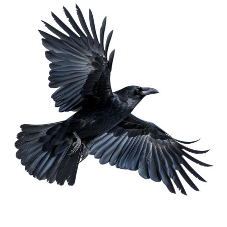 A black raven in mid-flight with its wings fully spread, isolated against a dark background.