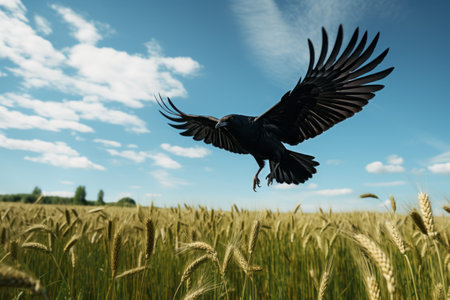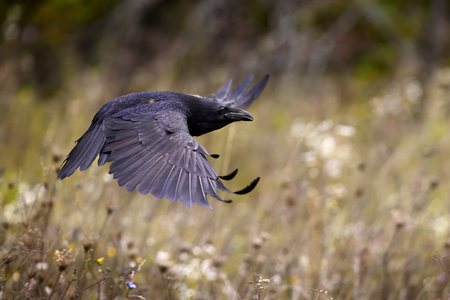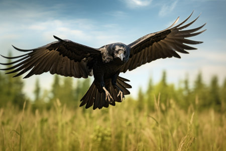 Graceful Encounter: A Crow Soars Across Verdant Meadows