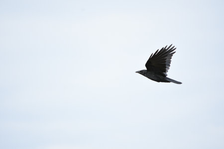 A black bird with its wings spread out is flying in the sky. The bird is the main focus of the image, and it is soaring high above the ground. The sky is clear and open, providing a sense of freedom