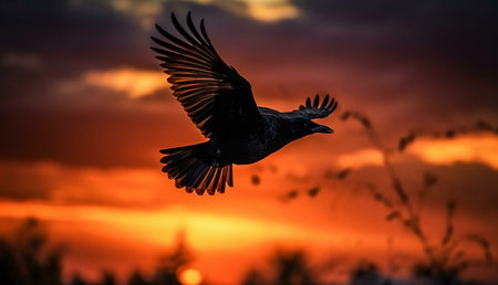 A black raven takes flight against a vibrant sunset, its silhouette beautifully contrasting the fiery orange hues of the sky.
