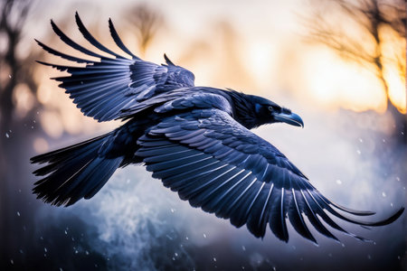 A black raven flies gracefully over a calm lake on a misty morning, with its wings fully spread. The golden sunrise light illuminates the bird and the serene natural background, creating a mystical atmosphere.