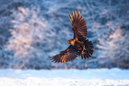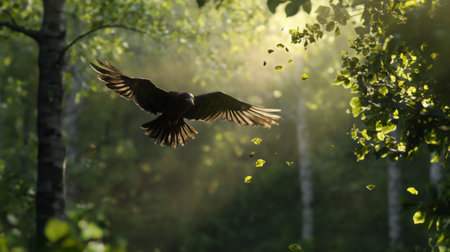 a black crow soars through a forest, bathed in golden light. this captivating image combines elements of narrative-driven visual storytelling, vray rendering, germanic art influences, unreal engine 5 technology, schlieren photography techniques, and intricately detailed costumes. ai generated