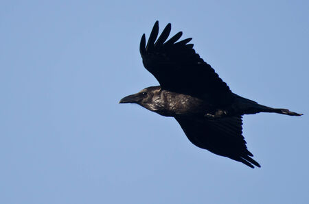 Common Raven, corvus corax, Adult in Flight against Blue Sky