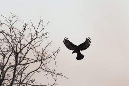 The Eerie Beauty of a Black Bird Soaring Above a Bare Tree --ar 3:2