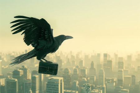 A black crow is flying over a city with a suitcase on its back. The image has a mysterious and eerie mood, as the crow is not a typical sight in a city setting