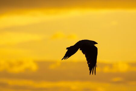 A graceful bird glides through the air, its silhouette outlined against a warm yellow backdrop. This enchanting moment captures the freedom and beauty of flight during the evening.