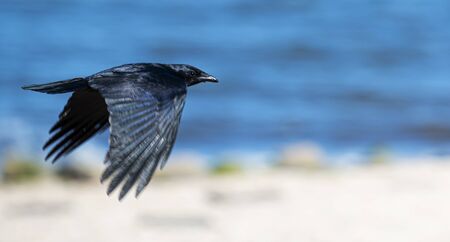 Horizontal view of close up of a blackbird flying over a beach on Long Island, New York, USA.