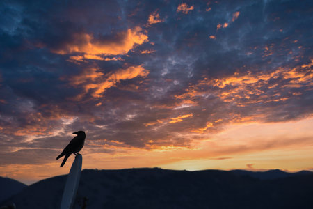 Silhouette of a crow on the background of a beautiful sunset