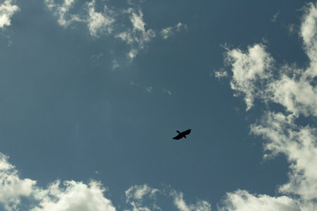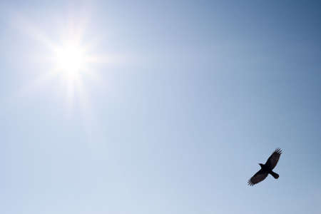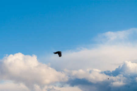 A beautiful silhouette of a flying crow against the blue sky. Flying bird in cloudy day.