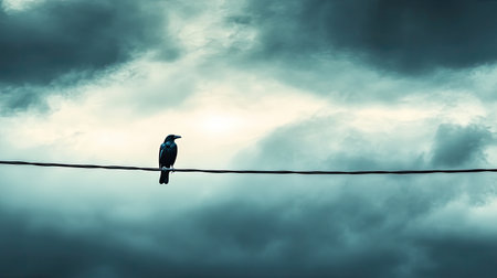A striking image of a solitary bird perched on a wire, set against a backdrop of dramatic clouds. The scene conveys a sense of loneliness and tranquility.