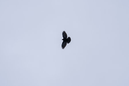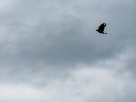 Silhouette of black crow flying over grey sky. Depressing dramatic background.