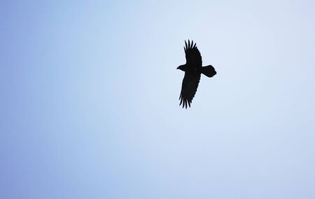 Crow is flying against the blue sky