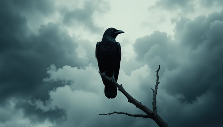 A raven stands alone on a bare branch, surrounded by dark, swirling clouds threatening rain.