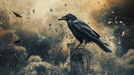 A dramatic scene featuring a crow perched on a stump with dark clouds and debris in the background.