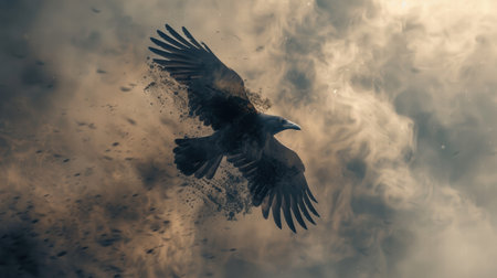 A majestic bird gracefully soars through a layer of dense fog, creating a dramatic and mysterious atmosphere. This captivating image captures the essence of freedom and elegance in nature.