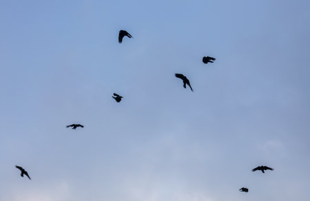 group of crows flying passing over clouds