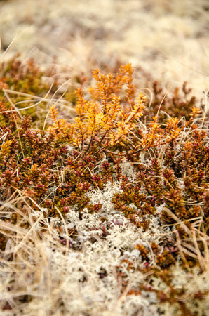 Arctic Tundra lichen moss close-up. Found primarily in areas of Arctic Tundra, alpine tundra, it is extremely cold-hardy. Cladonia rangiferina, also known as reindeer cup lichen.