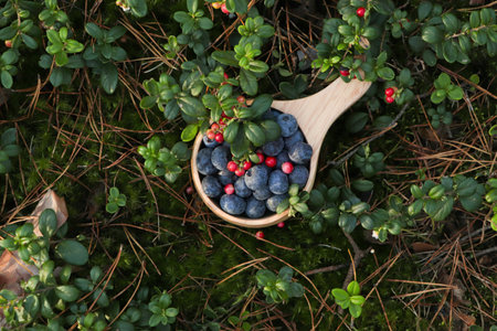 Wooden mug full of fresh ripe blueberries and lingonberries in grass, above view