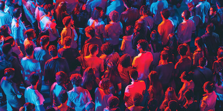 A vibrant aerial view of a large crowd of diverse individuals gathered at an outdoor event. The image captures the essence of unity, celebration, and social interaction.