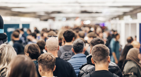 Crowd of walking people walking indoors. Overpopulation concept