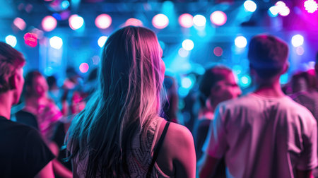 Rear view of a full concert hall of spectators, fans dancing and cheering. With colorful light effects