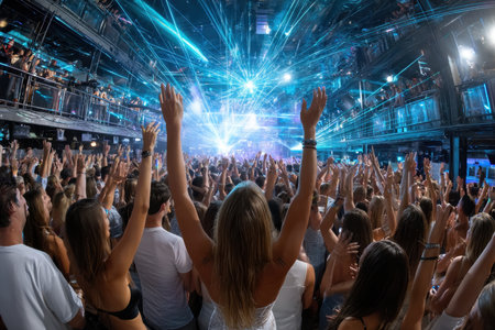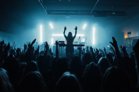 Stage lights and crowd of audience with hands raised at a music festival. Fans enjoying the party vibes.