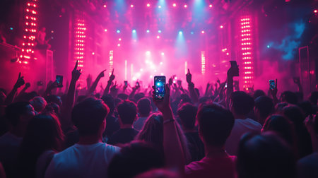 An enthusiastic audience is captured during a performance, illuminated by vibrant stage lighting. Hands reach towards the stage, while individuals record the event with their phones. The composition features a mix of colors and textures, suggesting a lively and energetic atmosphere suitable for various media applications.