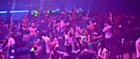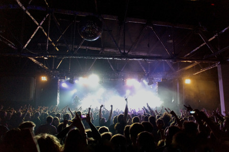 Crowd cheering at a live music concert in a nightclub with hands raised