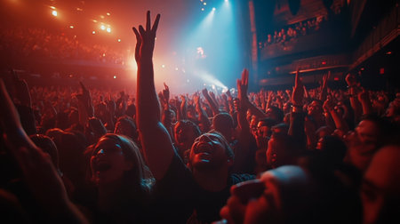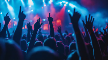 A dynamic and colourful concert scene showcasing an energetic crowd raising their hands. The vivid blue and red stage lighting creates an electrifying atmosphere, bringing the music to life.