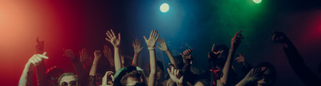 Energetic party crowd with raised hands under colorful stage lights. Banner
