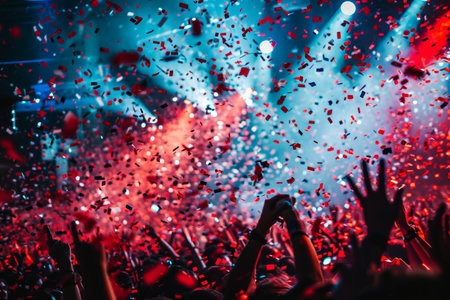 Energetic concert crowd celebrating under colorful confetti during an electrifying live performance at night