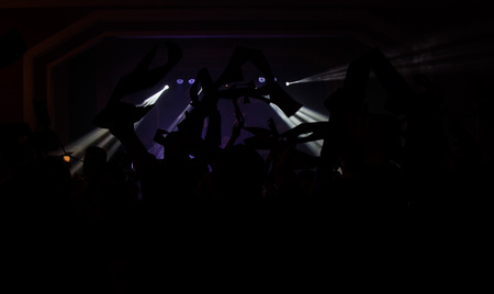 Silhouette of people with raised hands on concer. Crowd on music show