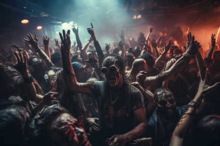 A large crowd of individuals standing closely together in a social gathering, A crowded dance floor with vibrant colors