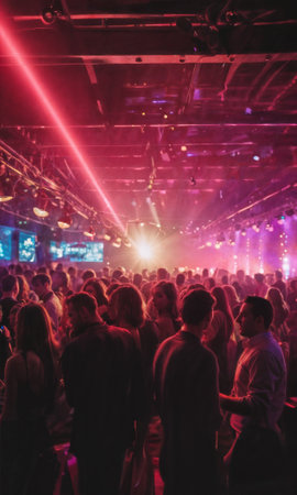 A lively crowd enjoys a night out, dancing and socializing in a vibrant nightclub filled with colorful lights and an energetic atmosphere.