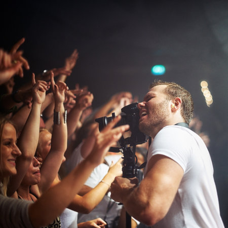 Getting the perfect action shot. A man filiming a crowd of people cheering.