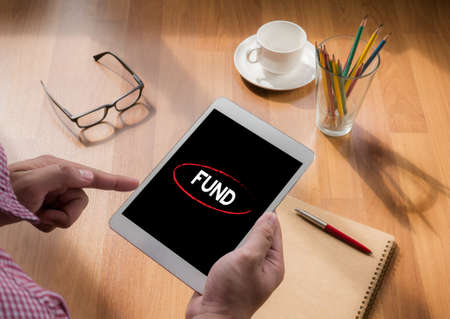 Fund Funding Donation Investment Budget Capital Concept, touch digital tablet, coffee