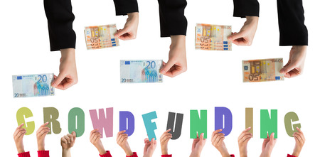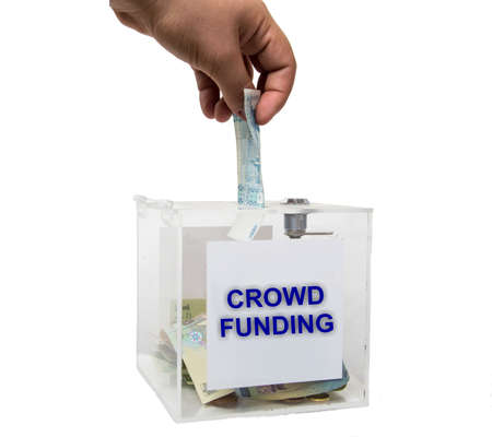 Hand inserting money in a box with crowd funding text on it. Concept suitable for crowdfunding, bussines angel, kickstart, collaborative finance. Copy space for text on the box.
