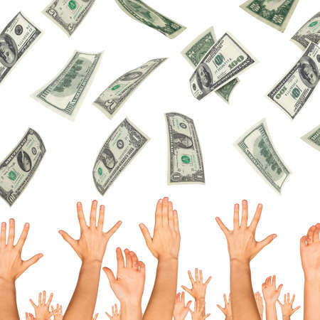 Several pairs of hands pick up dollar bills from the floor. Concept money rule the world.