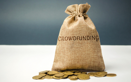Money bag with coins with the word crowdfunding. Voluntary association of money or resources via the Internet. Support recipients. Financing start-up companies and small businesses. Co-investment