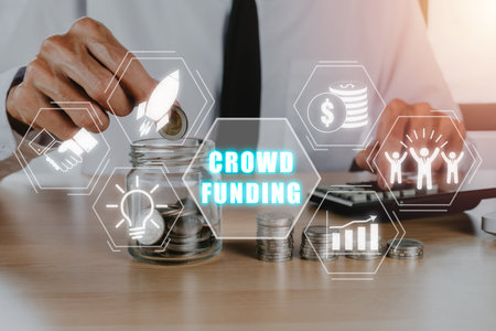 Crowdfunding concept, Business person hand putting money into jar glass with crowdfunding icon on virtual screen, Collaborative, Growth and return.