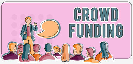 Conceptual caption Crowd Funding. Business overview Fundraising Kickstarter Startup Pledge Platform Donations Person delivering presentation displaying newest business strategies.
