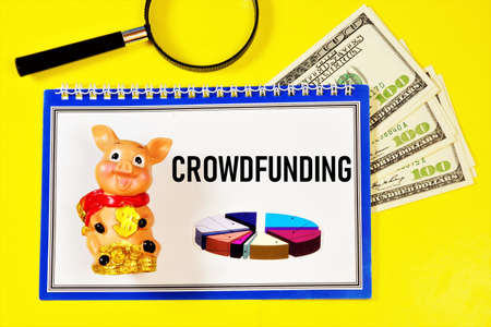 Crowdfunding-text inscription on the planning Notepad. Raising funds for financial, cultural and business projects. Selling shares of businesses to investors to achieve common goals.