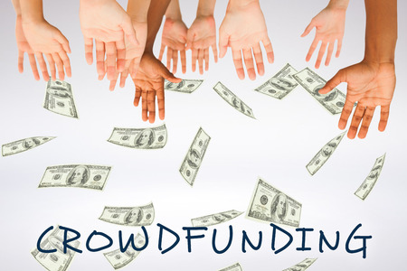 Businesswomans hand holding fifty euro notes against the word crowdfunding