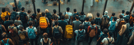 Refugees with suitcases and backpacks stand densely packed at a border, symbolizing their struggle for safety and a better future.