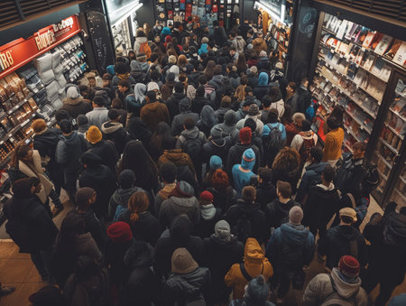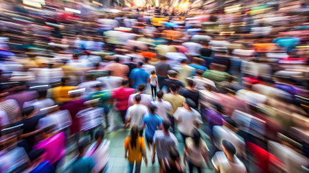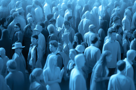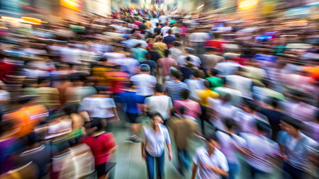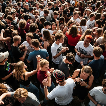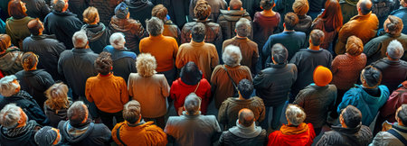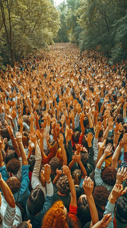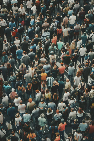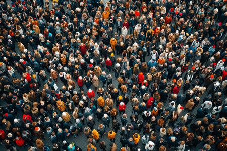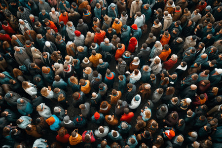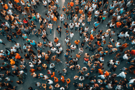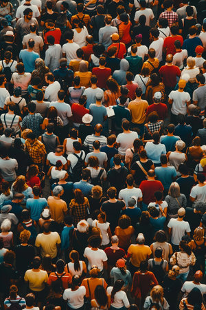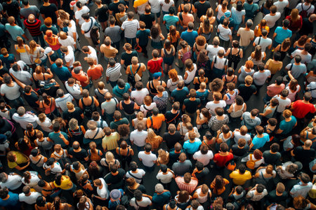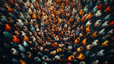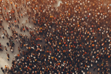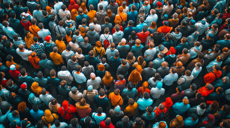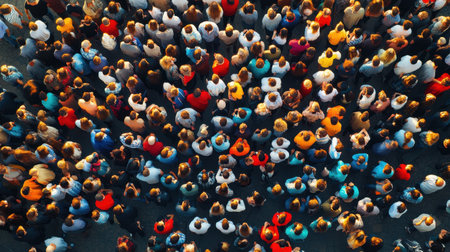 An impressive aerial view showcases a large diverse crowd gathered together, featuring vibrant colors and an energetic atmosphere, perfect for illustrating togetherness.