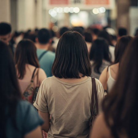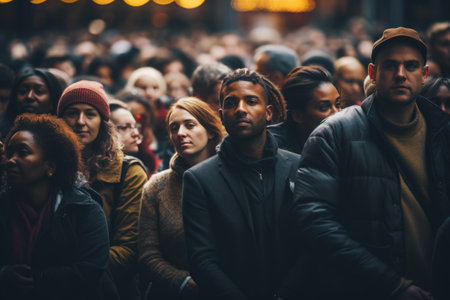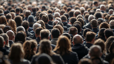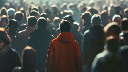 A lone man in a yellow jacket stands out amidst a dense crowd, viewed from behind, symbolizing individuality and isolation.