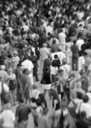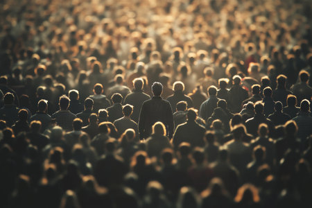 A crowd of people is silhouetted against a bright, undefined background. The image presents high contrast with dark figures and a stark white space. The composition emphasizes shadows and form, suggesting potential for use in a variety of visual concepts and artistic projects. Suitable for editorial and commercial applications.