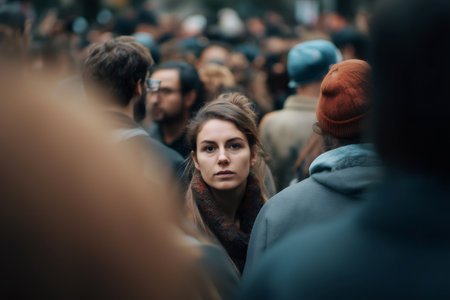 Portrait of a serious young woman standing apart from a blurred crowd, expressing concern during a political demonstration