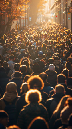 A vibrant scene capturing a diverse crowd of people gathered outdoors during sunset. The warm light enhances the atmosphere of togetherness and celebration.